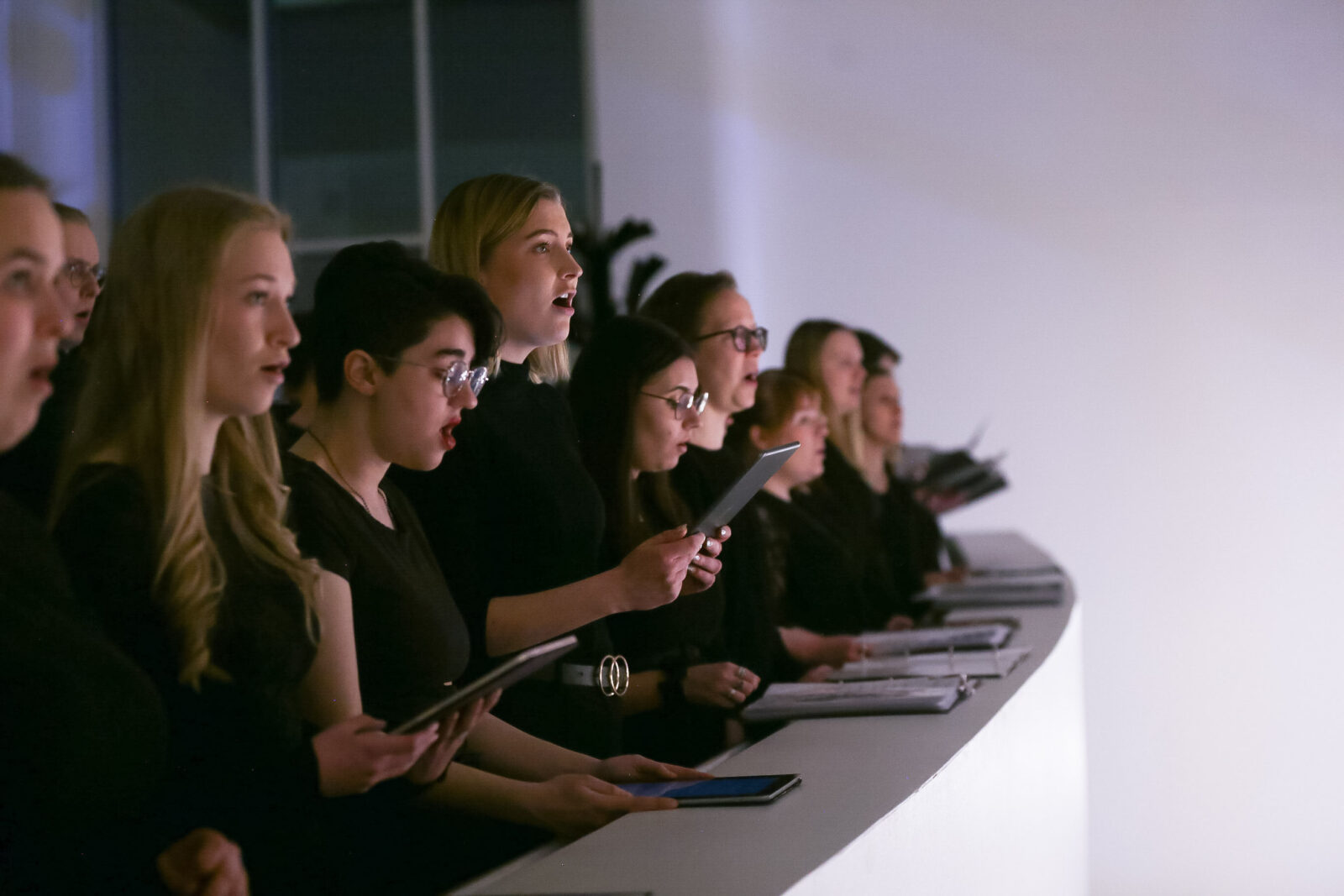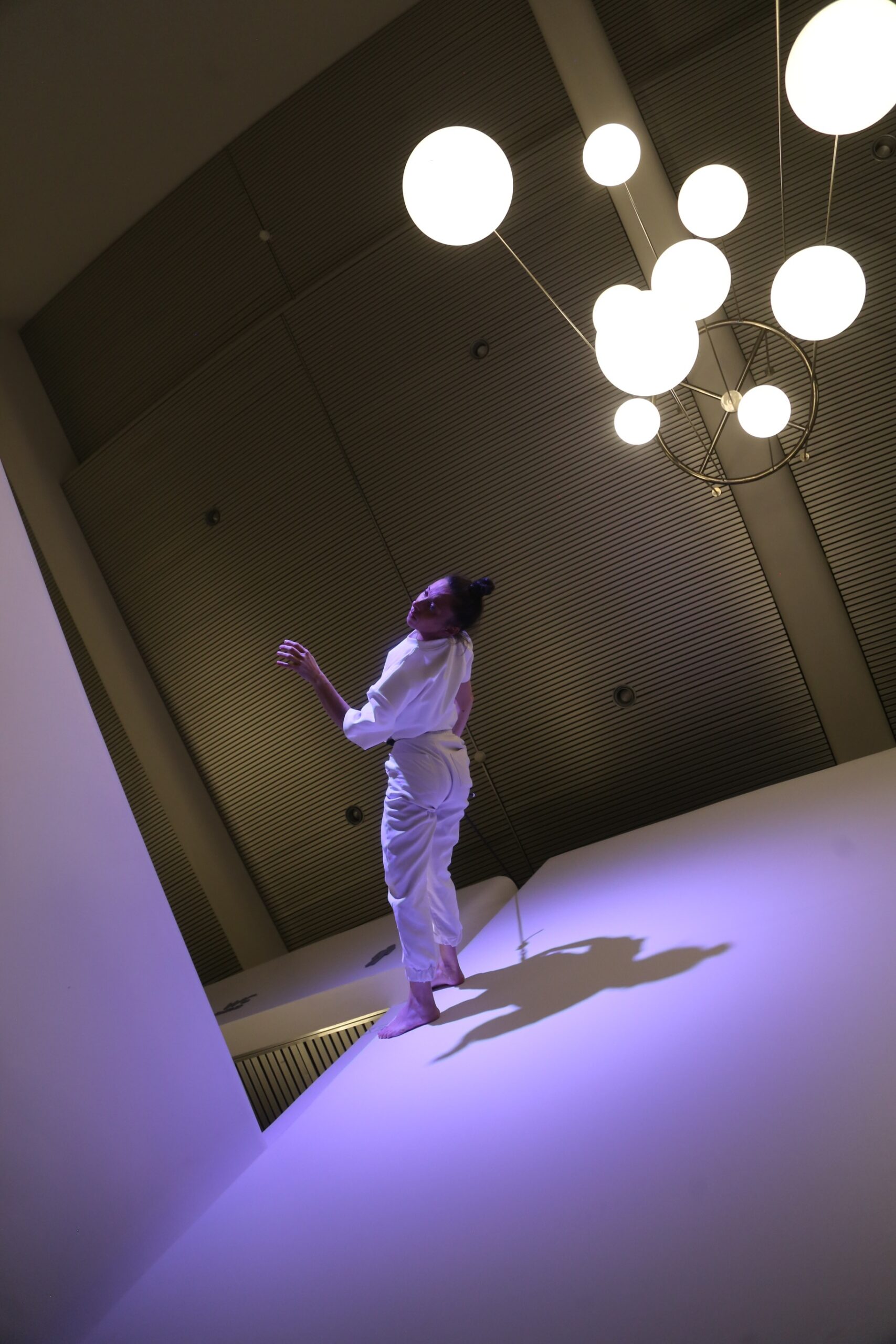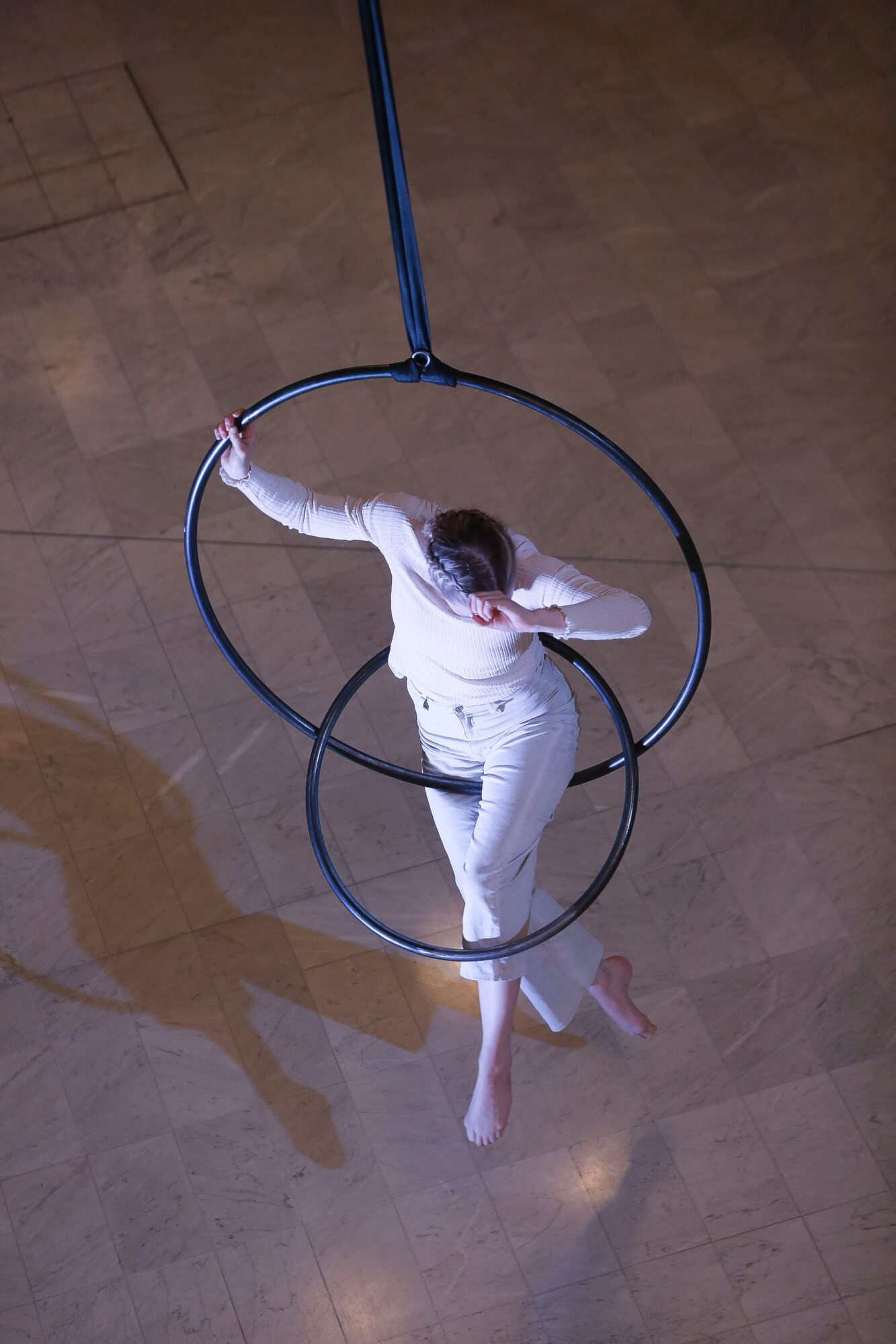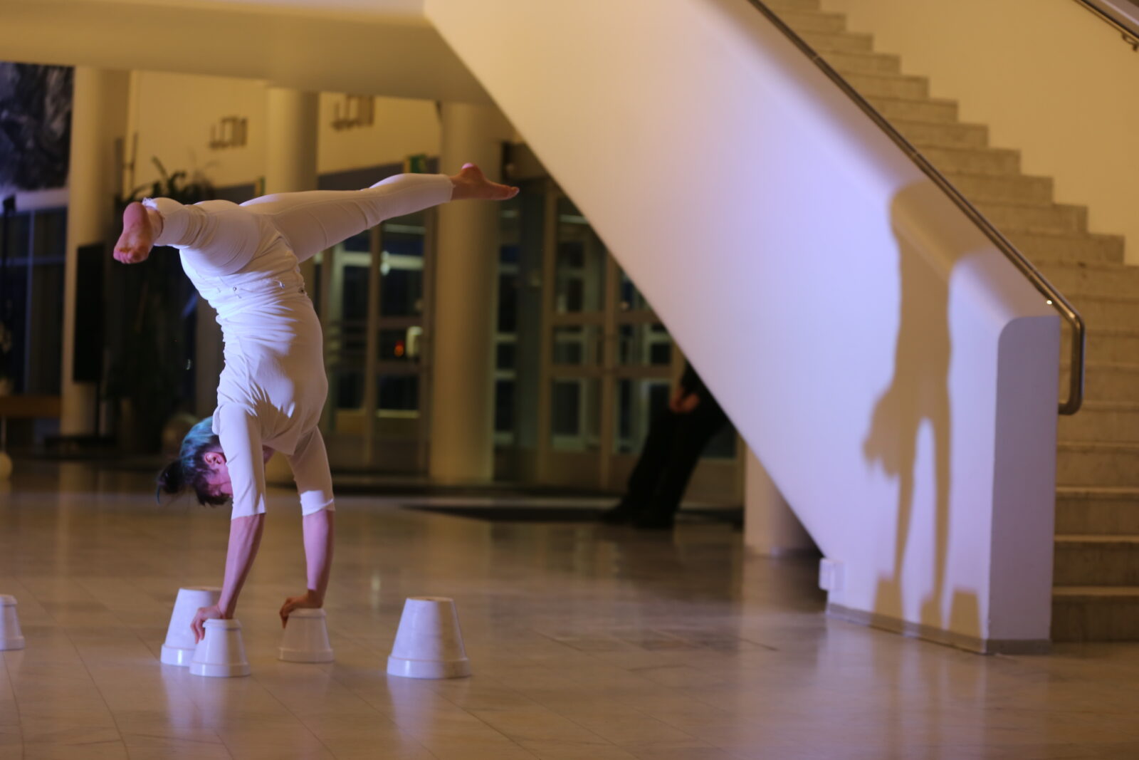 Chiaroscuro is a site-specific work combining contemporary circus and choral music. The architecture and light of the foyer of Madetoja Hall inspired the collaboration between the contemporary circus company Ilmatila and the Cassiopeia Choir. During the promenade performance the audience was invited to experience both choral music and aerial acrobatics at close range, with the choir performing across three different levels of the space.